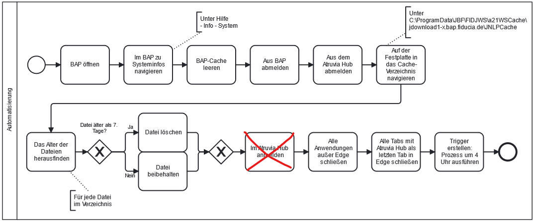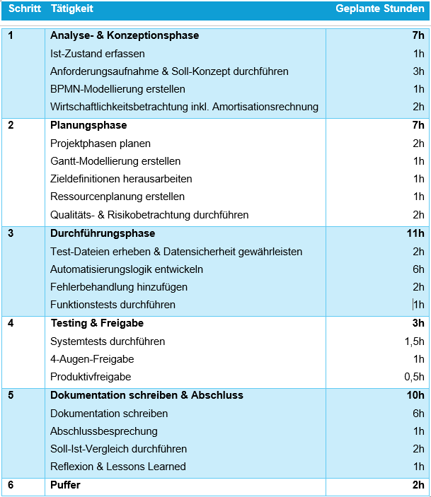 Ah, damit nicht jeder extra eine PDF runterladen muss: IHK-Vorgaben: Inhalt des Projektantrags Im Projektantrag müssen insbesondere folgende Angaben gemacht werden: •Projektbezeichnung -Thema der Projektarbeit, ggf. mit Kurzbeschreibung •Projektbeschreibung und Ausgangssituation -Projektanlass: Ist-Analyse (Angaben zum Ist-Stand) -Nutzendarstellung für den Kunden bzw. Ziel des Auftrages oder Anforderungen an den Auftrag: Soll-Konzept -Erläuterung des Geschäftsprozesses bzw. die Darstellung des praktischen Problems und der Eigenleistung -Transparente Abgrenzung des eigenen Beitrags zum Projekt gegenüber Beiträgen Dritter („Fremdleistung“) -Hilfsmittel (technische Einrichtung, Werkzeuge) -ggf. Einbindung in ein Gesamtprojekt (Angabe über die Einbindung in ein Gesamtpro-jekt, falls es sich um ein Teilprojekt handelt. -ggf. Schnittstellen des (Teil-)Projekts -(Angabe der Schnittstellen des (Teil-)Projekts innerhalb eines Gesamtprojekt) -Berücksichtigung technische und wirtschaftliche Aspekte (Querschnittsthemen) -Beachtung eventueller zu berücksichtigender Beschränkungen und Alternativen •Projektumfeld -Beschreibung des Projektumfelds (Umfeld beim Kunden und im Betrieb) •Projektphasen mit Zeitplanung in Stunden: -Identifikation/Definition der Haupt-/Kernaufgaben des Projekts -Zuordnung von Zeitumfängen in Stunden zu diesen Aufgaben; (die auf Seite 8 angegebenen Bearbeitungszeiten sind unbedingt zu beachten.) -zeitliche Abhängigkeiten •Dokumentation/technische Unterlagen: -kurze Angaben zu praxisüblichen Unterlagen, benötigten Werkzeugen, Arbeitsmitteln, technischen Einrichtungen etc. 1. Thema der Projektarbeit Entwicklung und Einrichtung eines Roboters zur automatisierten Systemreinigung zu Tagesstart. Vor Entwicklung soll der geplante, gesparte manuelle Zeitaufwand geschätzt und die Entwicklung des Roboters auf Wirtschaftlichkeit überprüft werden. Ziel ist es die Systemstabilität in den automatisierten Geschäftsprozessen zu erhöhen und die Fehleranfälligkeit zu reduzieren. 2. Projektbeschreibung und Ausgangssituation Ist-Analyse Mein Projekt „RPA zur Systemreinigung am Tagesstart“ geht aus einem internen Auftrag meines Vorgesetzten aus der Abteilung „Digitale Transformation & Produktionssteuerung“ unseres Betriebes (Genossenschaftsbank) hervor. Unsere Bank nutzt viele automatisierte Geschäftsprozesse, welche von Robotern via RPA durchgeführt werden und maßgeblich zu der Wertschöpfung des Betriebes beitragen. Von den etwa 254 fehlerhaften Roboterprozessen im Monat, nutzen ca. 141 Prozesse den Bankenarbeitsplatz. Da über eine Remote-Support-Anwendung auf den Roboter zugegriffen wird, ist die Systemleistung bereits stark ausgelastet. Besonders fehleranfällig sind die Prozesse, welche Kundendaten in den Bankenarbeitsplatz einbinden. Bei Ausfall eines solchen Prozesses bleibt der Roboter stehen - nachdem Änderungen vorgenommen, aber bevor diese vollendet und gespeichert wurden. Dies führt dazu, dass eine manuelle Fehlerbehebung ab Stillstandzeitpunkt vorgenommen werden muss, welches Fachwissen der Bankenprozesse voraussetzt und zeitliche Aufwände von durchschnittlich 5-15 Minuten verursacht, teilweise für zwei Mitarbeiter. Momentan wird der Bankenarbeitsplatz-Cache unregelmäßig und erst nach dem Auffallen von Problemen manuell gelöscht. Soll-Konzept Auftrag dieses Projektes ist es, einen RPA-Workflow mit UiPath Studio zu entwickeln, der täglich vor Arbeitsstart des Roboters automatisch den Cache des Bankenarbeitsplatzes sowie auf der Festplatte leert und laufende Anwendungen beendet. Der tägliche Trigger wird über die zentrale Verwaltungsplattform mit UiPath Orchestrator erstellt. Ziel dieses Workflows ist es, die Systemeffizienz zu steigern und die Fehleranfälligkeit zu senken, damit ein reibungsloserer Betrieb des Unattended-Roboters gewährleistet wird. Weiterhin soll manueller Aufwand aufgrund der Fehlerbehebung reduziert werden und die Zeit der Mitarbeiter für höherwertige Aufgaben freigegeben werden. Der Mehrwert des Projektes soll berechnet und die Wirtschaftlichkeit geprüft werden. Weiterhin sollen Qualitätsmaßnahmen sowie Verfügbarkeit der Daten gewährleistet sein. Dies geschieht durch Backup-Dateien, 4-Augen-Prinzip, Dokumentation und Testing. Weiterhin werden Arbeitsschritte im Workflow geloggt, um die Wartbarkeit und Übersichtlichkeit sicherzustellen. Es wird ausschließlich ein Roboter zur Systemreinigung entwickelt, alle Folgeprozesse sind bereits in Betrieb. Es wird keine weiteren Schnittstellen erstellt. Anforderungen Folgende Anforderungen sollen durch das Projekt erfüllt werden: -Wirtschaftlichkeit des Projektes soll aufgezeigt werden -Backup-Dateien des Cache erstellen -Cache des Bankenarbeitsplatzes soll geleert werden -Der Nutzer soll aus Atruvia Hub abgemeldet werden -Festplatten-Cache des Bankenarbeitsplatzes soll geleert werden -Laufende Anwendungen sollen beendet werden -Ein Trigger soll vor Tagesstart erstellt werden -Einhalten von Datenschutz und Datensicherheit -Einhalten von betrieblichen Compliance-Vorgaben 3. Projektumfeld Das Projekt wird im Unternehmensrahmen der genossenschaftlichen BANKNAME mit Hauptsitz in Köln durchgeführt. Das Unternehmen besteht seit 1872, bietet traditionelle so wie auch moderne Finanzleistungen an und richtet sich mit Ihrem Angebot vor allem an Privatkunden und Arbeitnehmer in der Region. Die BANKNAME beschäftigt rund 120 Mitarbeiter und betreibt weitere Beratungszentren, um die Nähe zu ihren rund 100.000 Kunden sicherzustellen. Als Genossenschaftsbank ist jedes der über 57.000 Mitglieder Teilhaber der Bank – somit liegt der Fokus nicht auf Gewinnmaximierung, sondern Mitgliederförderung, Nachhaltigkeit, regionaler Verantwortung und demokratischer Teilhabe. Die organisatorische Struktur teilt sich in die beiden Hauptbereiche Vertrieb und Betrieb auf. Der Prüfling ist Teil der Abteilung Digitale Transformation & Produktionssteuerung, welche sich auf unterster Abte
