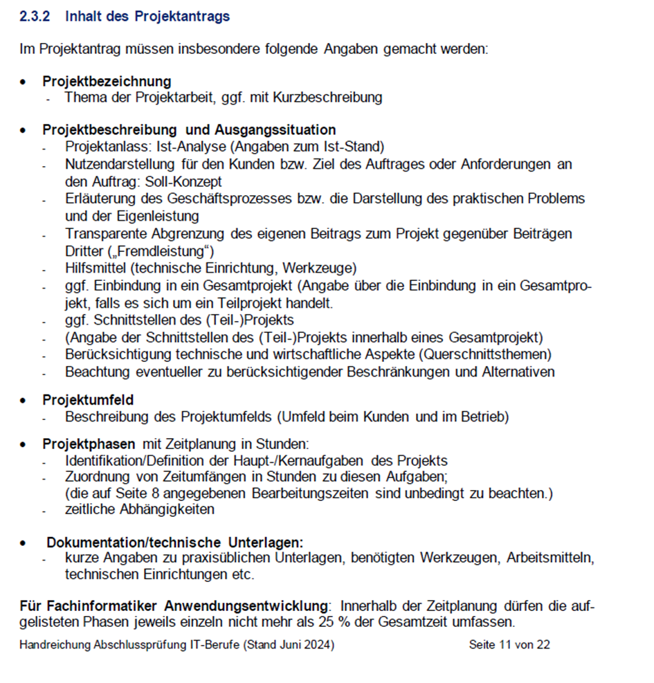 Also Projektantrag Abgabefrist ist 12.02.2026 Durchführungszeit fürs Projekt: 15.03 - 15.04 Abgabefrist für Projektdokumentation: 23.04.2026 Und den Termin für die schriftliche Prüfung habe ich noch nicht bekommen. Die Informationen zu den Prüfungen bekomme ich von meiner IHK erst Mitte Dezember zugeschickt