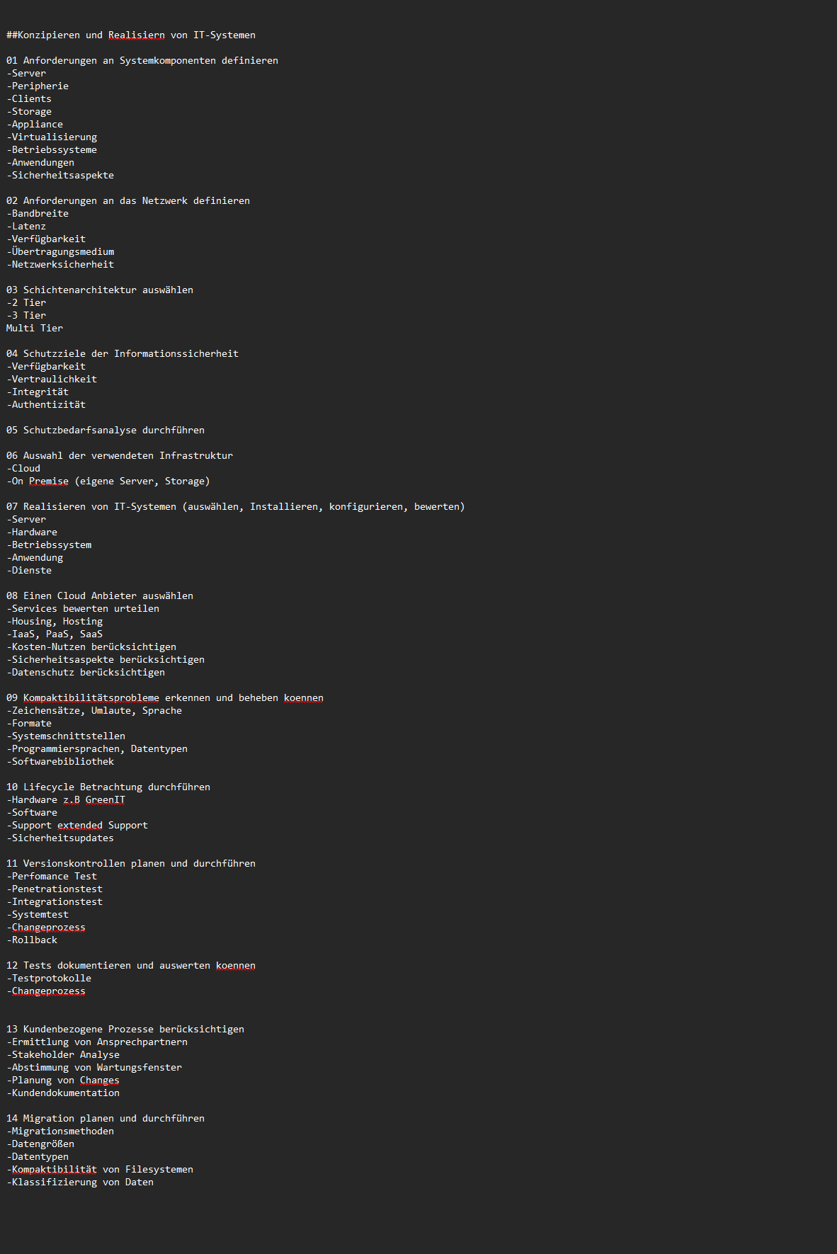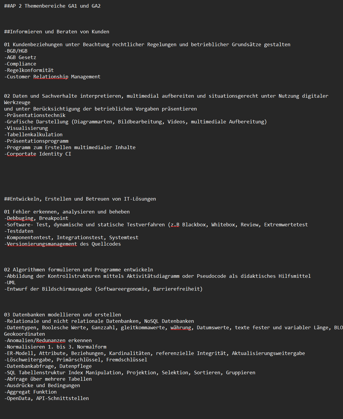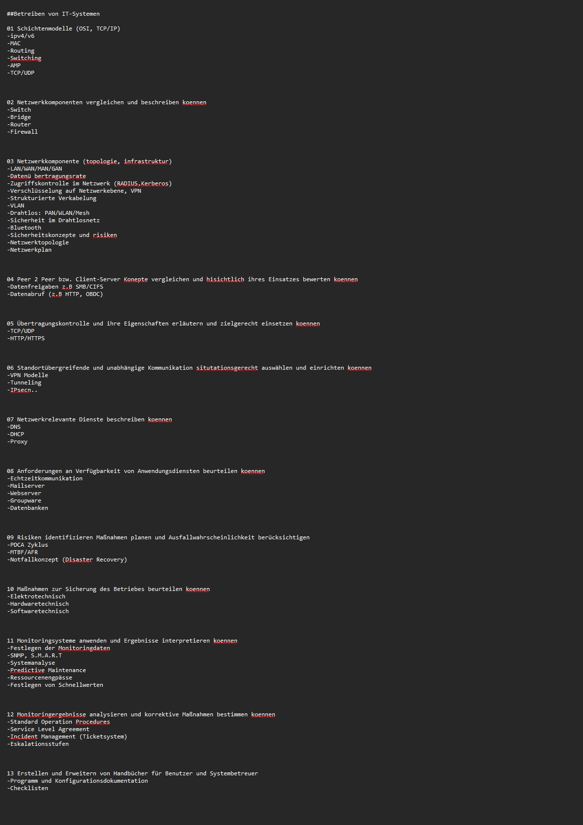Eine große Ansage an alle die jetzt auch die IHK-Winterprüfung 2025 im Bereich Systemintegration schreiben. Da die IHK uns nicht konkret die Prüfungsthemen vorlegt, sondern diese im Prüfungskatalog erworben werden muss. Habe ich GA1 u. GA2 Themen in einer txt. verpackt, ein paar Themen doppeln sich als Unterpunkt sind aber je nach Abschnitt auch anders zu verstehen/anzuwenden. Viel Erfolg beim Lernen :)