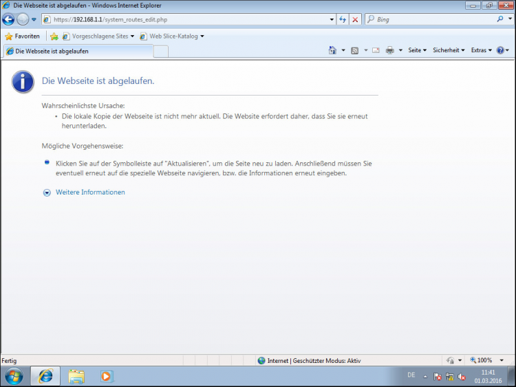Hallo, Wenn ich in meiner pfsense unter System --> Routing im Tab Routes eine Route hinzufüge, und auf Save klicke, erscheint die 'Fehlermeldung' "Die Website ist abgelaufen" (siehe Anhang). Ich habe eine Zweite pfsense, auf der dies einwandfrei klappt. Bei beiden versuche ichs mitm Internet Explorer. Da die beiden pfsense über das gleiche ISO installiert wurden liegts nicht am Release. Jemand ne Idee worans liegen könnte? Schonmal Danke und Gruß