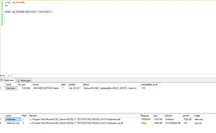 21. Februar 20178 j Autor Hallo, Die reine Syntax (sp_databases) gibt mir allerdings nicht die Werte der Data- und Logfiles aus. Siehe Bild. Nutze ich den Befehl exec sp_helpdb @dbname= 'Autos' - werden mir die Daten der Files sowie die allgemeinen DB-Daten ausgeben. Ich nutze SQL Server 2012, MSSQL. Wie gesagt, ich möchte lediglich meine Datenbanken nach den Files abfragen inklusive der Spalte maxsize und growth Paramtern. Bearbeitet 21. Februar 20178 j von 50-IP