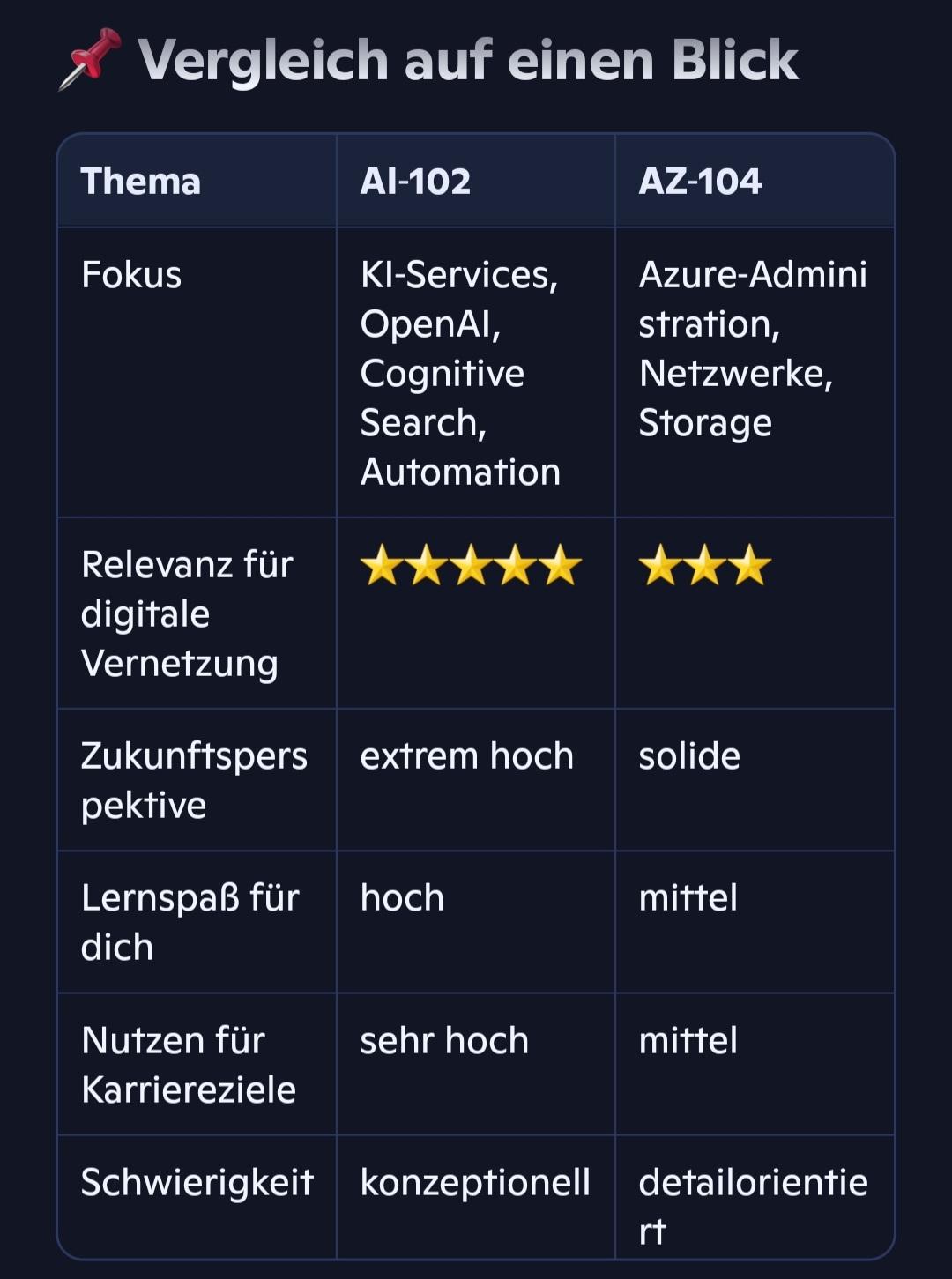vor 9 Stunden9 h Na ja, wenn es um Kernkompetenzen mit Deiner Job-Rolle zu tun hat, wäre doch eher zu dem AZ-104 zu raten, da es quasi Brot-Und-Butter-Wissen vermittelt, sofern MS Technik in Deinem Unternehmen genutzt wird.Der andere Kurs mag Nice-To-Have sein, aber die Frage nach dem Nutzen wäre doch eher Projektbezogen. Das heißt konkret, wenn aktuell keine Projekte zu dem Thema anstehen, würde es keinen direkten Nutzen bringen (auch wenn es interessant klingt).Da würde ich vielleicht erst mal im Unternehmen nachfragen, wie dort der Nutzen eingeschätzt wird und das in die Entscheidung mit einbeziehen.Aber die Entscheidung liegt natürlich bei Dir. Ich gebe nur zu denken, dass beide Themen auch ihre EInarbeitungszeit fordern.